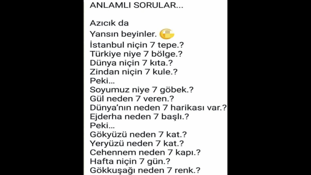Örneğin İstanbul niçin 7 tepe.? Türkiye niye 7 bölge.? Dünya niçin 7 kıta.? Zindan niçin 7 kule.? Peki…