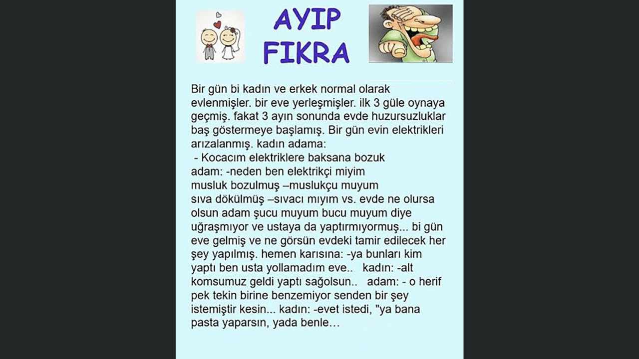 Bir gün bir kadın ve erkek normal olarak evlenmişler ve bir eve yerleşmişler. ilk 3 ayları laylaylom güle oynaya geçmiş. fakat 3 ayın sonunda evde huzursuzluklar baş göstermeye başlamış. Bir gün evin elektrikleri arızalanmış. Kadın adama: – Kocacığım elektriklere baksana bozulmuş. Adam: – Neden ben elektrikçi miyim? Musluk bozulmuş – ben muslukçu muyum? Sıva dökülmüş – sıvacı mıyım vs. evde ne olursa olsun adam umursamıyor, şucu muyum bucu muyum diye hep geçiştiriyor uğraşmıyor ve ustaya da yaptırmıyormuş. Bir gün eve gelmiş ve ne görsün, evdeki tamir edilecek ne varsa hepsi tamir edilmiş. Adam hemen karısına: – Ya kadın bunları kim yaptı ben usta filan da yollamadım eve.. Kadın: – Alt komşumuz geldi yaptı hepsini sağolsun..