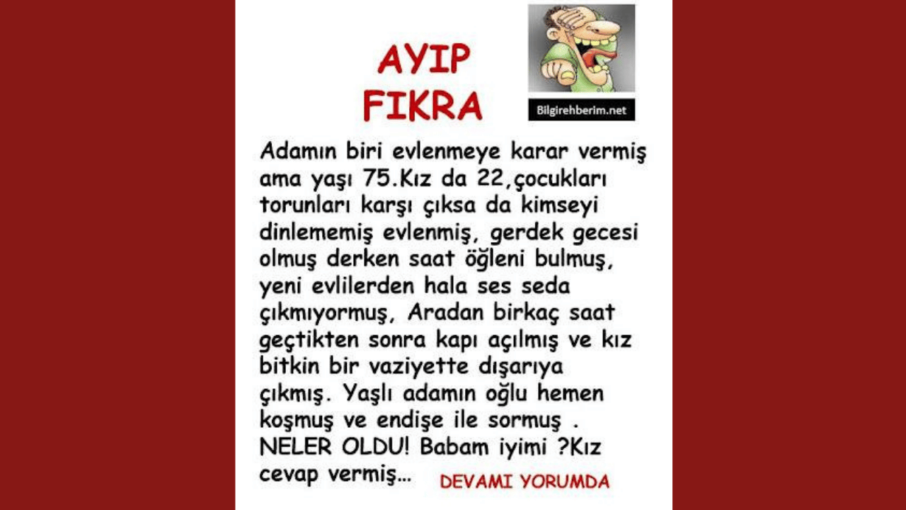 Okuyanı Gülme Krizine Sokan Komik Fıkra.. Adamın biri evlenmeye karar vermiş ama yaşı 75. Kız da 22,çocukları torunları adamı evlenmesin diye ikna etmeye başlamışlar, babacım bak yaşın ilerde kalbin dayanmaz diye ama adamı ikna ne mümkün kimseyi dinlememiş evlenmiş, Gerdek gecesi olmuş derken saat öğleni bulmuş, Yeni evlilerden hala ses seda çıkmıyormuş. Aradan birkaç saat geçtikten sonra kapı açılmış ve kız bitkin bir vaziyette dışarıya çıkmış. Yaşlı adamın oğlu hemen koşmuş ve endişe ile sormuş. Neler oldu! Babam iyi mi ? Kız cevap vermiş.. Evet çok iyi idi demiş. Ben yoruldum da ,biraz mola verdik diye ilave etmiş . Çocuk Allah Allah! 75 yaşında bir adam nasıl oluyor da bu kadar aktif olabiliyor deyince kız, yok canım demiş aktif değil adam bunak, yapıyor unutuyor, yapıyor unutuyor.. Okuduğunuz için teşekkür ederiz umarız beğenmişsinizdir.