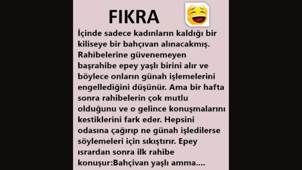 Oldukça komik bir fıkra mutlaka okuyunuz! İçinde sadece kadınların kaldığı bir kiliseye bir bahçıvan alınacakmış. Rahibelerine güvenemeyen başrahibe epey yaşlı birini alır ve böylece onların günah işlemelerini engellediğini düşünür. Ama bir hafta sonra rahibelerin çok mutlu olduğunu ve o gelince konuşmalarını kestiklerini fark eder. Hepsini odasına çağırıp ne günah işledilerse söylemeleri için sıkıştırır. Epey ısrardan sonra ilk rahibe konuşur: – Odasına girdim, bahçıvan yaşlıydı ama.. Devamı diğer sayfada