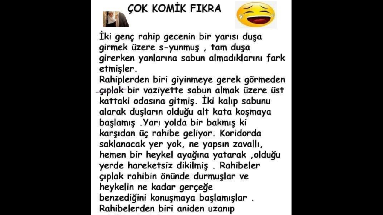 FIKRA: İki genç rahip gecenin bir yarısı duşa girmek üzere s-yunmuşlar ve tam duşa girecekken yanlarına sabun almadıklarını fark etmişler. Rahiplerden biri giyinmeye lüzum görmeden çıplak bir vaziyette sabun alabilmek üzere üst kattaki odasına gitmiş. İki kalıp sabunu alarak duşların bulunduğu alt kata koşmaya başlamış. Yarı yolda bir bakmış ki karşıdan üç rahibe geliyor. Koridorda saklanacak yer yok, ne yapsın zavallı, anında bir heykel ayağına yatarak, bulunduğu yerde hareket etmeden dikilmiş. Rahibeler çıpl*k rahibin önünde durmuşlar ve heykelin ne kadar gerçeğe benzediğini konuşmaya başlamışlar.