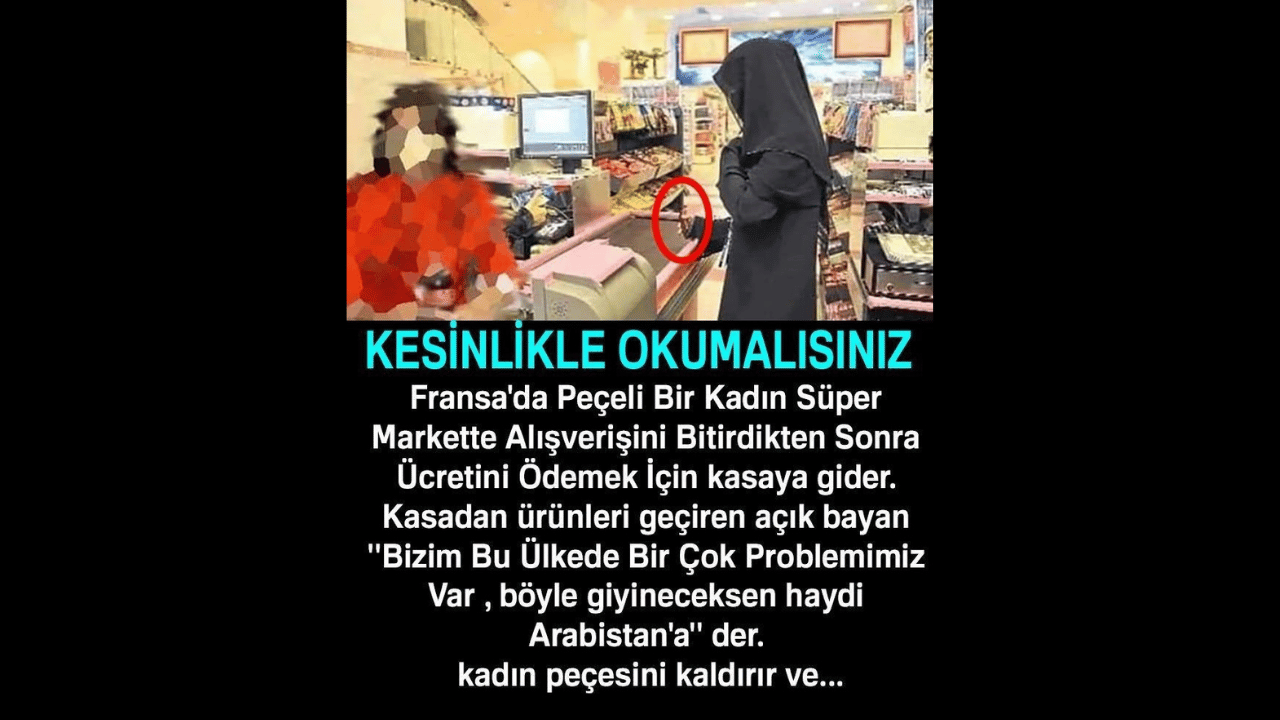 Kasanın önünde sıra bekleyen kapalı bayan birkaç dakika sonra sıranın kendisine gelmesiyle kasiyere doğru ilerler. Kasadaki bayan tesettürsüz yani başı açık bir müslümandır. Bu bayan çarşaflı peçeli hanımın eşyalarını birer birer kasadan geçirmeye başlar, bir müddet sonra müşterisine “Bizim bu ülkede birçok problemlerimiz var ve senin peçen de bunlardan biri. Biz gurbetçiler ticaret için buradayız, dinimizi veya tarihimizi göstermek için değil… Eğer dinini yaşamak, çarşaf giymek ve peçe takmak istiyorsan, ülkene geri dön, orada ne yapmak istiyorsan onu yap der ve sonrasında..