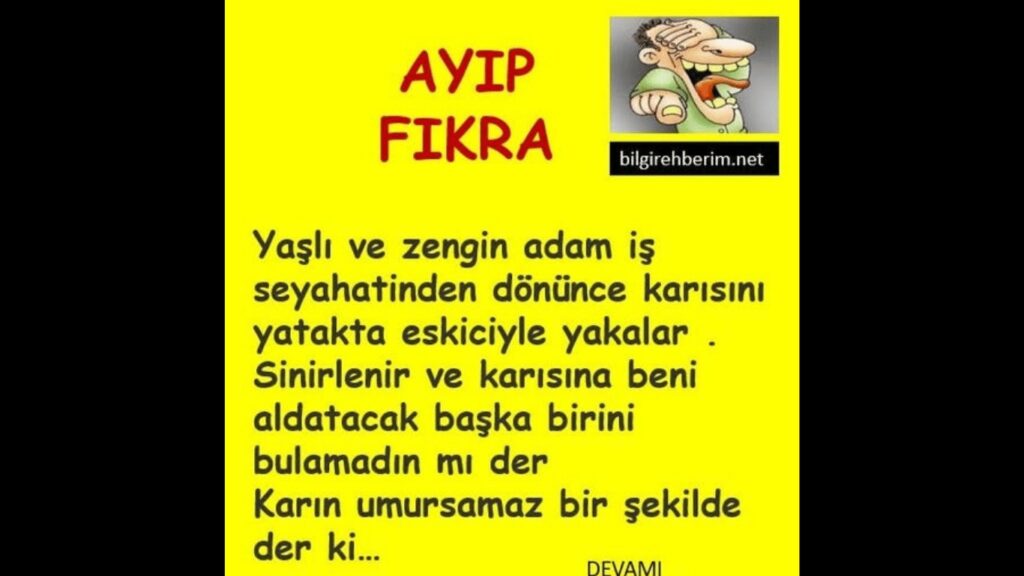 Fıkra olur da böylemi komik olur arkadaş bu neya karnım ağrıdı gülmekten.. Yaşlı ve zengin adam iş seyahatlerinden sonra eve gittiğinde karısını yatakta eskiciyle yakalar. Karısına beni aldatacak başkasını bulamadın mı der ve..