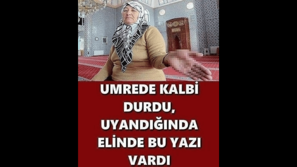 Daha öncesinde gördüğü rüya üzerine Eskişehir’e cami yaptırmasıyla gündeme gelen Aynur Eken’in umredeyken elinde bir işaret belirdi. Aynur Eken’in umredeyken kalbi durdu uyandığında elinde bu cümleler yazıyordu. Kâbeye 10 metre mesafedeydi. Umrede kalbi durdu. Öldü zennedip hastaneye kaldırdılar. İşte ne olduysa ondan sonra oldu. Kadın birden uyanınca herkes korktu. Kadın uyandığında ise elinde bakın ne yazıyordu? İşte kadının avuç içinde yazanlar..